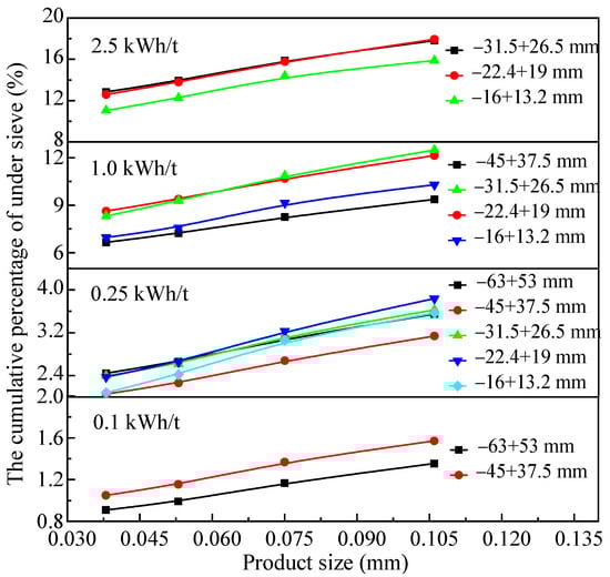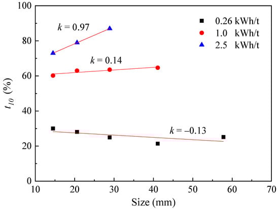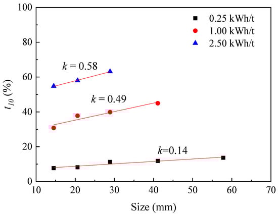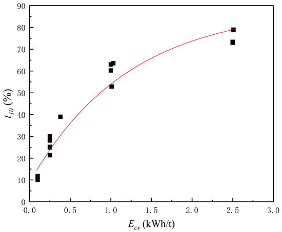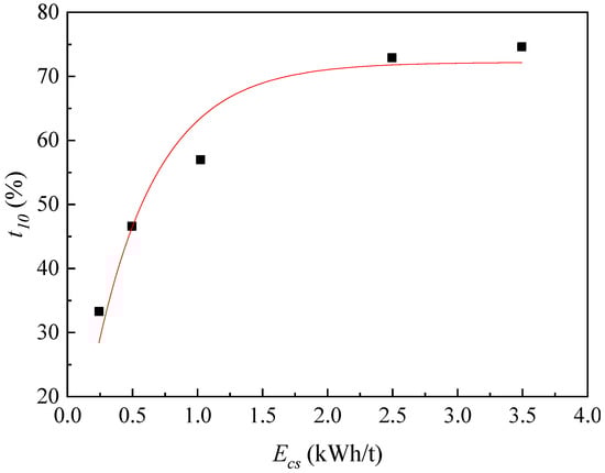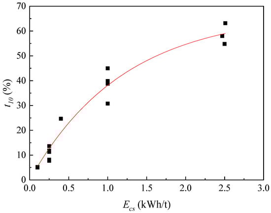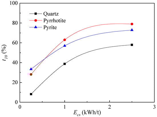 - Ecs has a significant impact on the particle size distribution and crushing effect of the crushing product and has an interactive impact on the feed particle size and mineral species. Overall, with increases in Ecs, the crushing effect of mineral samples increases. Moreover, there is a critical Ecs in impact crushing. Under the conditions of this study, the critical Ecs is 1.0 kWh/t. When Ecs > 1.0 kWh/t, t10 increases with the increase in Ecs and decreases with the increase in feed particle size. When Ecs < 1.0 kWh/t, t10 increases with the increase in Ecs, independent of feed particle size.
