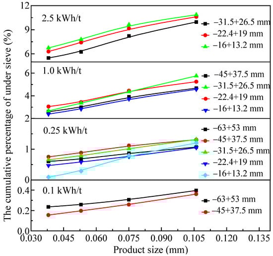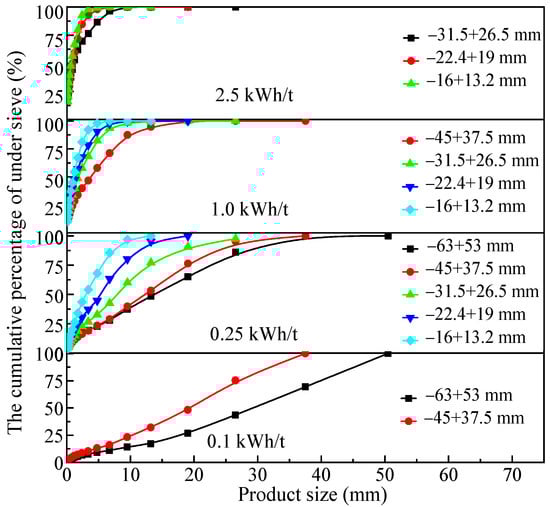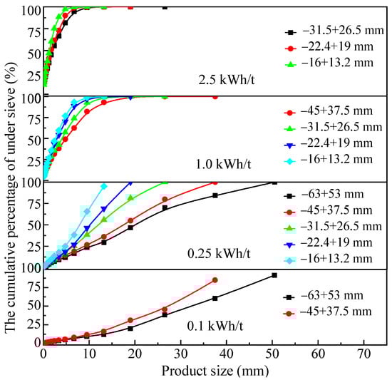 3.2.1. Analysis Results of the Particle Size Composition of Impact Crushing Products Obtained by the JK Drop Weight Test