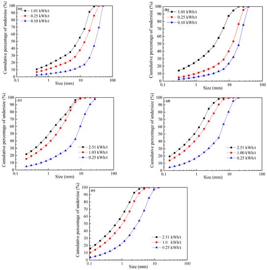 - The particle size distribution of the impact crushing products of quartz, pyrrhotite, and pyrite samples is very wide, covering all particle sizes from “0” to close to the feed particle size. However, the yield of the +0.106 mm particle size was significantly higher than the yield of the −0.106 mm particle size. This indicates that impact action has a significant contribution to the formation of +0.106 mm particle size products in the crushed products.
