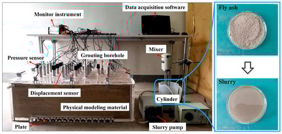 The three-dimensional experimental system consisted of a main visualization experimental device, a strip plate that simulated coal seam mining, physical modeling material, a slurry preparation and filling unit, an adjustable speed mixer, a constant rate slurry pump, pressure sensors, displacement sensors, data monitor instruments, and data acquisition software (Figure 3).