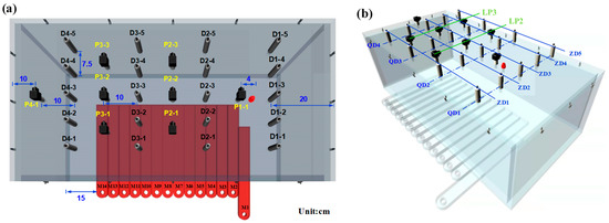 Sensor number and measuring line arrangement: (a) pressure and displacement measurement point arrangement scheme and (b) measuring line serial numbers.