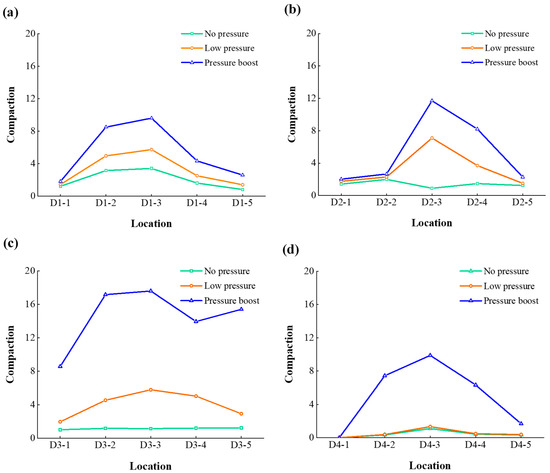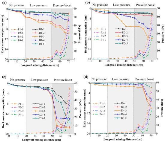 Rock masses compaction at different distances from the borehole at different pressure stages. (a) Inclined measurement line QD1 compaction, −40 mm from the borehole. (b) Inclined measurement line QD2 compaction, 240 mm from the borehole. (c) Inclined measurement line QD3 compaction, 440 mm from the borehole. (d) Inclined measurement line QD4 compaction, 640 mm from the borehole.