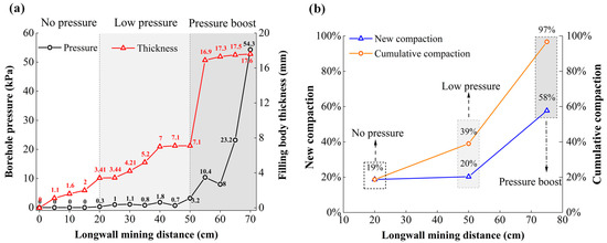 Relationship between the borehole pressure and rock masses compaction during grouting: (a) relationship between the ultimate rock masses compaction, the borehole pressure, and the working face mining distance and (b) rock masses compaction in no-pressure, low-pressure, and pressure-boost stages.