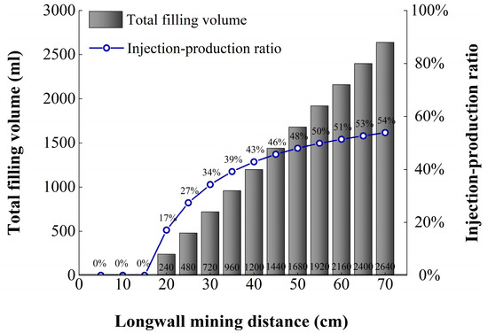 Relationship between the longwall workface mining distance, the total grouting volume, and the injection ratio.