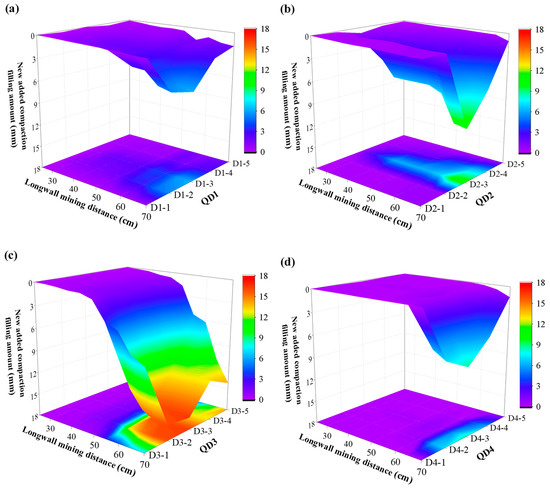 Spatial distribution of newly added compaction filling amount during grout filling. (a) Distribution of the newly added compaction filling amount at the inclined measurement line QD1, −40 mm from the borehole. (b) Distribution of the newly added compaction filling amount at the inclined measurement line QD2, 240 mm from the borehole. (c) Distribution of the newly added compaction filling amount at the inclined measurement line QD3, 440 mm from the borehole. (d) Distribution of the newly added compaction filling amount at the inclined measurement line QD4, 640 mm from the borehole.