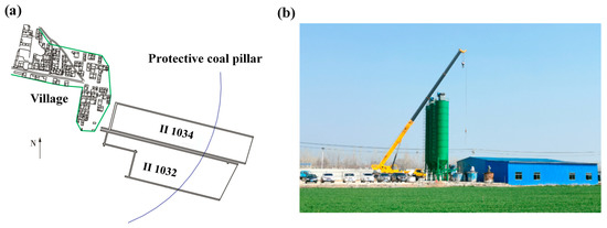 The Linhuan coal mine is located in Huaibei, Anhui Province, China, and an overburden isolation grout-filling mining test was performed in the II1034 longwall workface to protect surface buildings (Figure 10). The II1034 working face has a regular rectangular arrangement, with a strike length of 544 m; the mining width is 110 m, and the mining height is 3 m. Grouting was implemented in the adjacent working face II1032. On the basis of the actual measurement data from the working face II1034, the accumulated volume of the injected compacted filling was calculated to be 93,761 m3, of which the total mining distance of the working face during the no-pressure stage was 90 m with 3035 m3 of grouting injection and the total mining distance of the working face during the pressurized stage was 544 m with 90,726 m3 of grouting injection.