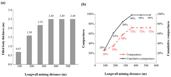 Relationship for the Linhuan II1034 working face between the mining distance, the maximum filled body thickness, and the compactness: (a) relationship between the working face mining distance and the maximum filled body thickness and (b) relationship between the working face mining distance and the compactness of rock masses.