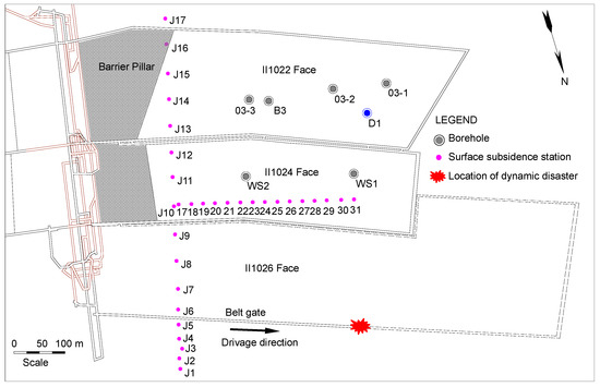 The Haizi coal mine is located in Suixi, Anhui Province, China. To ensure safe mining under the hard rock layer, overburden isolation injection filling was implemented on the II1022 and II1024 working faces, with working face strike lengths of 560 m and 520 m, respectively, mining widths of 210 m and 160 m, respectively, and mining heights of 2.5 m (Figure 12).