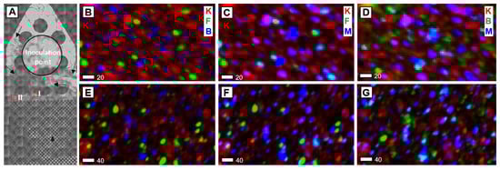 Potassium XRF images of SSH surface exposed to hyphae for 30 days. (A) Optical microscopy image of micromodel after 30 days, prior to the removal of hyphae. The edge of the inoculation point is denoted by the black circle. Arrows point to fungal hyphae which range in density across the SSH surface. Red boxes outline the regions mapped by XRF. Regions were chosen based on distance from inoculation point (carbon source) and hyphal density. (B–D) region I, (E–G) = region II. Column 1: kaolinite (K—red), feldspar (F—green) and biotite (B—blue). Column 2: kaolinite (K—red), feldspar (F—green) and montmorillonite (M—blue). Column 3: kaolinite (K—red), biotite (B—green) and montmorillonite (M—blue). In all maps, feldspar and kaolinite are scaled to the same total counts, which is 2× that of biotite and montmorillonite, which are scaled to the same counts as each other. Region I is rotated 90 degrees to the left compared to optical microscopy image. Scale bar is in microns.