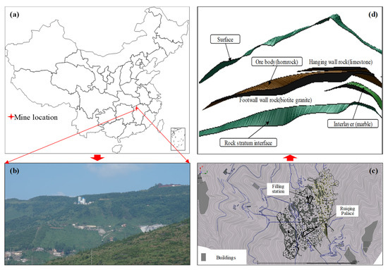 Xianglushan Tungsten Mine is located in the northwest of Jiangxi Province, China (as shown in Figure 1a), and the surface morphology presented in Figure 1b shows that it has rich scheelite resource reserves (discovered in 1958 and put into production in 1991)—the second largest scheelite discovered in China [38]. The anticline structure of the mining area is gentle (as shown in Figure 1c), and the deposit is concealed [39,40] (as shown in Figure 1d). In addition, its shape is variable, and the rock strata are widely metamorphosed, resulting in large differences in the distribution of mine ground pressure [41,42,43,44,45].