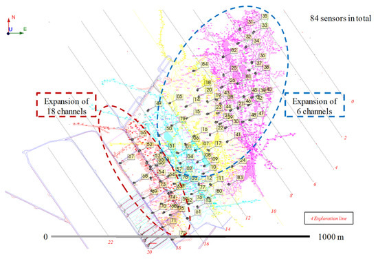 According to the mining stage and scale, the east and west areas are divided by the 16# exploration line. A total of 24 new sensors are added. Eighteen sensors are distributed and installed between lines 16–18# in the west area. Six sensors are installed in the east of the 16-wire amplifier. Since the establishment of a 48-channel microseismic monitoring system underground in October 2010, a total of 4 years of uninterrupted monitoring had been carried out by September 2014. The total number of channels was expanded to 60 channels and 84 channels in September 2012 and September 2013, respectively, and the monitoring coverage was gradually expanded from the eastern residual mining area to the western mining area with 18~20 lines. The sensors in the east area mainly cover the pillars in the thick and large goaf. As shown in Figure 2, the cylinder is a sensor, numbered 1~84. There are 84 sensors in the expanded microseismic monitoring network.