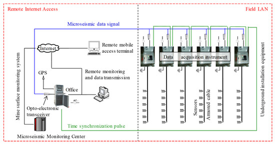 Figure 3 presents the network topology of the microseismic monitoring system of Xianglushan Tungsten Mine. It shows the location and distribution of sensors in different zones. The topology is composed of sensors of signal acquisition hardware, Paladin of data acquisition and processing system, special cables of signal transmission and time synchronization system, software of integrated positioning and parameter calculation system, “brain” processing system of remote collaborative monitoring, and machine subsystem system of information transmission and network sharing system. All sensors were fixed in the borehole by recyclable sensors to fully couple with the rock mass. Sensor cables were laid from underground to the surface through specific stopes and shafts. A new generation of high-precision multi-channel intelligent microseismic monitoring data analysis system for rock fracture developed by ESG company was installed in the ground control room. This intelligent monitoring system can effectively filter out environmental noise, which ensures that the data acquisition system and source positioning system operate accurately and normally. Microseismic data were recorded continuously at a sampling rate of 2000 Hz.