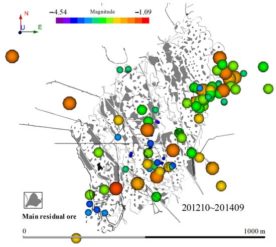 Figure 4 shows the position relationship between the magnitude of the microseismic location event and the plane distribution. Figure 4 shows the magnitude and plane position distribution of the center of the earthquake, and the spherical shape represents the location and magnitude of the event. The color purple to red represents increasing magnitude, and the size of the spherical shape from small to large represents increasing magnitude.