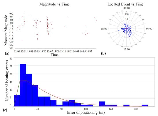 Characteristic distribution of microseismic monitoring events. (a) Time and magnitude. (b) NumA number of events at different times in a single day. (c) Location accuracy of microseismic events (X-axis: positioning error; Y-axis: number of events; Red line: corresponding percentage).