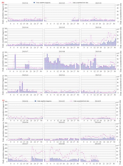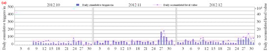 Daily ground pressure trend chart in the study period (daily cumulative trigger events and daily cumulative level value). (a) October 2011–December 2011. (b) January 2012–December 2012. (c) January 2013–September 2013.
