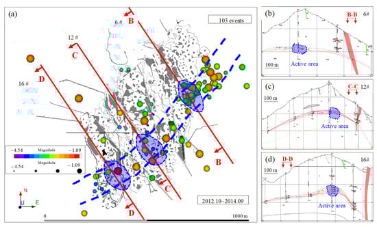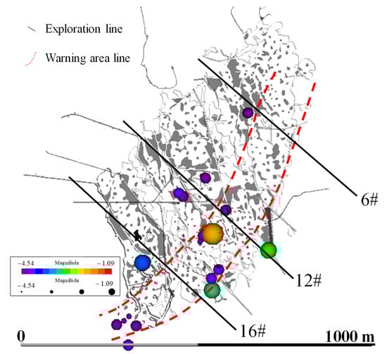 The microseismic positioning events monitored in the past two years are reproduced in the plane. As shown in Figure 7a, through observation and analysis, microseismic positioning events are mainly concentrated and distributed in the band area formed by two blue dotted lines in the figure. The strike of the strip area is the same as that of the ore body. In addition, the profiles of 6#, 12#, and 16# exploration lines are shown in Figure 7b–d, respectively. The location of microseismic location events is also delineated in the profiles of 6#, 12#, and 16# exploration lines. It can be seen that these positions are located at the place with the largest buried depth in the mined-out area, at the core of the “anticlinal” ore body, with a maximum buried depth of 200~300 m. The above microseismic monitoring data show that the microseismic positioning events in the mined-out areas with large burial depths are more concentrated than those in other areas.
