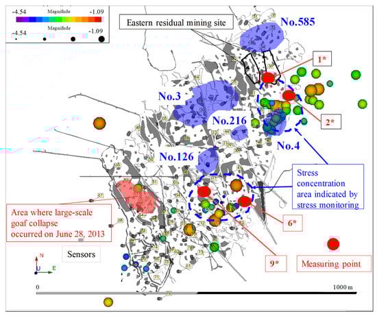 In terms of the overall stress transfer of the mine, a comprehensive diagram of the underground microseismic monitoring and the location of the stress gauge from 28 June 28 2013 to September 2014 is shown in Figure 8, which shows the collapse of the large-scale mined-out area at the fourth pit mouth of the eastern residual mining area that occurred on 28 June 2013. It can be seen from the figure that the stress concentration areas reflected by the stress monitoring are consistent with the microseismic active areas reflected by the microseismic monitoring. This shows that there is great consistency between the active area of microseism and the area of stress concentration. After the production limit in the east of the two regions, small-scale collapse and other ground pressure phenomena continue to occur in local areas, indicating that the stress monitoring and microseismic monitoring have achieved good monitoring results, and the reflected underground ground pressure characteristics are consistent and reflect the actual situation.