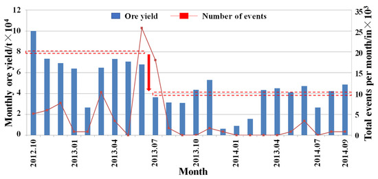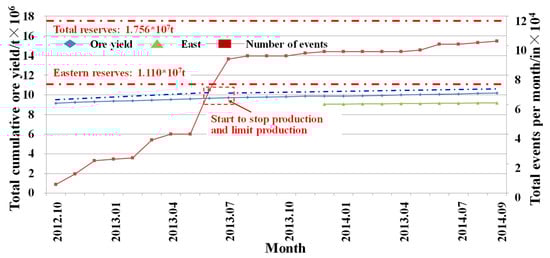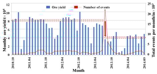 Firstly, this is an approximate working condition comparison, which is an auxiliary pavement for the study of the ground pressure distribution pattern. The potential pattern of this type of event is reflected from different levels side by side. The underground ore yield was kept at 70,000~80,000 tons/month before the production limit in July 2013. After the production limit in the east, the ore yield was reduced to about 40,000 tons/month. Figure 10 shows the changing trend of monthly ore output from October 2010 to September 2014. At the same time, starting from the establishment of the microseismic system, the total number of single-channel events in the underground every month was counted, and its corresponding relationship with the monthly ore output is shown in Figure 11.