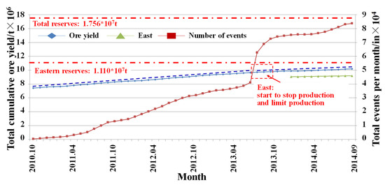At the same time, the mining disturbance in the eastern mining area was significantly reduced by limiting production. The overall microseismic activity of the mine gradually recovered to the level before the large-scale collapse. In general, the ground pressure transfer and stress concentration show obvious consistency with the change in ore yield. Figure 14 shows the relationship between the cumulative ore yield and the cumulative total number of positioning events. Specifically, the total number of localized events per month is no more than 4, ranging from 0 to 4, with an average of about 0.8.