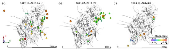 From October 2012 to September 2014, 103 microseismic positioning events were monitored underground. The spatial distribution of microseismic events is presented in Figure 12a–c, which shows the spatial location of the location event during the period from October 2012 to 28 June 2013, from 28 June 2013 to 30 September 2013, and from October 2013 to September 2014.