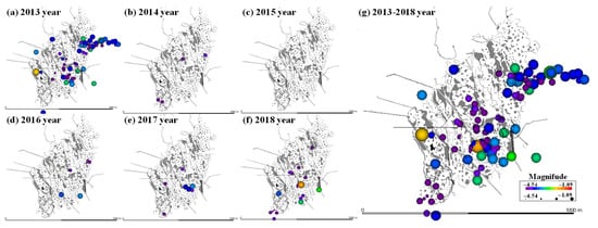 Through the above analysis, we know the characteristics of the distribution and transfer of mine stress and its production-related activity characteristics during the analysis period. In addition, the overall data are consistent by year, and they do show obvious changes. The spatial distribution and evolution of microseismic positioning events monitored underground from 2013 to 2018 are shown in Figure 15. In terms of the overall evolution, it shows the specific location, magnitude, and aggregated location and magnitude information of microseismic positioning events each year. It also shows how to verify it by other auxiliary methods, and then verify the relationship between ground pressure and microseismic events by parameters such as surface subsidence and energy release.