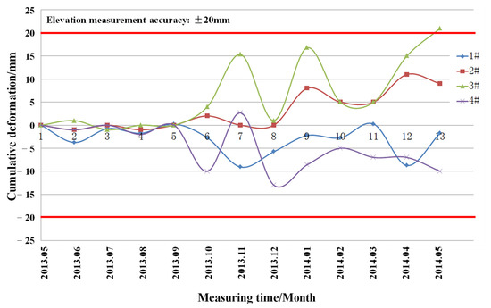 Through the survey point layout and data monitoring and analysis of specific underground points, we can see that the deformation of all survey points on the surface is not obvious in all directions except for the accumulated deformation of 20 mm in the due north direction of 1 * survey point (the horizontal survey accuracy is 10 mm). However, there are large fluctuation anomalies. Figure 16 shows the development trend of total settlement in the elevation direction of each measuring point on the surface. It can be seen that the surface settlement deformation is not obvious and has not caused a major hard impact temporarily. Continuous observation should be maintained to assess its future development trend.