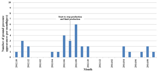 From October 2012 to September 2014, a total of 32 cases of ground pressure manifestation were counted through monitoring and warning cases of the microseismic monitoring system. These ground pressures show different scales, for example, large-scale collapse, local pillar cracking, and roof fall, on 28 June 2013.