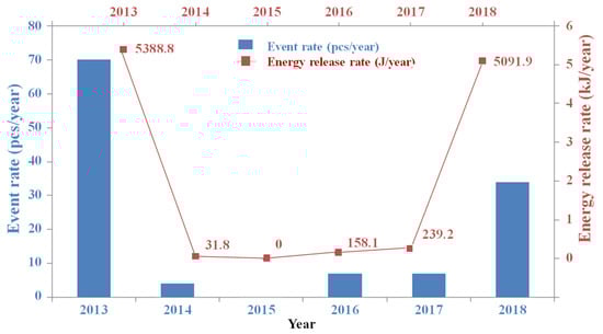 From Figure 15, it can be seen that the spatial distribution and evolution process of microseismic positioning events were monitored underground from 2013 to 2018. The figure shows in detail the specific location and magnitude of microseismic positioning events for each year. Combined with the change of the whole process, we analyzed the change law of microseismic events and their energy release to reflect the characteristics of ground pressure change from the side and verify them. The annual event rate and cumulative energy release rate of underground microseismic positioning are shown in Figure 18.