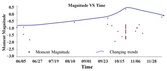 With the release of energy, the characteristics of moment magnitude change of microseismic events reflect the magnitude and indicate the degree of damage. It can reflect the fracture area, average dislocation momentum, and shear modulus of rock at the dislocation of microseismic events. The changing trend of the moment magnitude of microseismic positioning events with time in 2018 is presented in Figure 20, which shows that, in October 2018, the maximum moment magnitude reached 0.3.