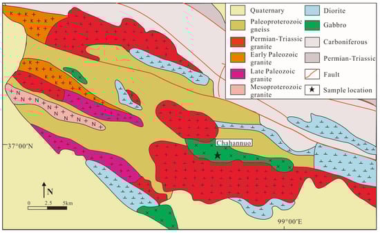The northern margin of the Qaidam Basin, representing the junction between the Qinling–Qilian and East Kunlun tectonic belts, is a key area for studying the late Hercynian–Indosinian geotectonics and evolution of the Paleo-Tethys [23]. The object of this study are the Chahannuo gabbros, located in the most well exposed area of the Carboniferous–Triassic rocks from the eastern part of the northern margin of the Qaidam Basin. Here, we report original petrological, zircon U–Pb ages, and whole-rock geochemical data of the Chahannuo gabbros to provide insights into the late Paleozoic–early Mesozoic tectonic evolution of the northern margin of the Qaidam Basin.