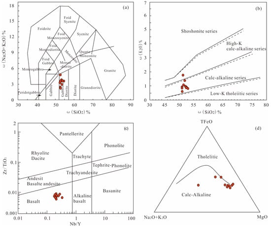 Total alkali vs. silica (TAS) (a); K2O vs. SiO2 (b); Zr/TiO2 vs. Nb/Y (c); and TFeO-Na2O + K2O-MgO diagrams (d), modified from [44,45] for Chahannuo gabbros samples.