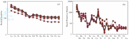 Chondrite-normalized rare earth element distribution patterns (a) and primitive mantle-normalized trace element spider diagrams (b); normalization values are from [49,50].