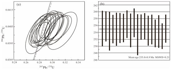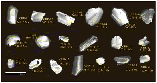Zircon U–Pb results are listed in Table 2. Most zircon grains from the Chahannuo gabbros are colorless to pale brown, euhedral to subhedral, and 100–200 µm long with shape ratios of 1:1–2:1 (Figure 6). Most grains display clear oscillatory and concentric zoning, and many grains show convoluted and truncated zoning. These features, together with their high Th/U ratios (mostly > 0.4), indicate a magmatic origin [51,52,53,54,55,56]. To ensure the accuracy of the ages, analysis points were selected within the oscillatory zones. Most analyses plot on or near the concordia, yielding a weighted mean 206Pb/238U age of 255.0 ± 0.9 Ma (late Permian; Figure 7).