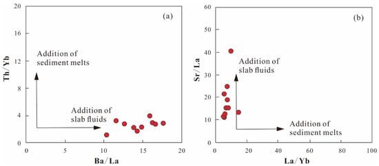 The Chahannuo gabbros have high Th/Yb ratios (1.21–4.05), suggesting that they were affected by a subduction component [69]. Different subduction components produce arc magmas with different geochemical characteristics [70,71,72,73]. Magmas formed by fluid metasomatism often have higher LILE (e.g., Rb, Ba, and Sr), P, and U contents and thus have higher Ba/Nb, Ba/Th, and Sr/Th ratios [70,71,72,73], whereas magmas formed by melt metasomatism often have higher LREE and Th contents and Th/Ce ratios [74,75,76,77,78]. The Chahannuo gabbros have high Ba/Th (25.75–81.87) and Sr/Th (29.29–94.06) ratios and low Th contents (6.69–228) and Th/Ce ratios (0.11–0.25). In addition, during subduction, hydrous fluid will generally inhibit the crystallization of plagioclase, which results in negative Eu anomalies in the residual melt [79]. There are no clear negative Eu anomalies in the Chahannuo gabbros, suggesting that the fractional crystallization of plagioclase was limited. Trace element ratios (e.g., Th/Yb, Ba/La, Sr/La, and La/Yb) may indicate the input of hydrous fluid or subducted sediments. The Chahannuo gabbros samples have a narrow range of Th/Yb (1.21–4.05) and La/Yb (5.38–14.41) ratios and a wider range of Ba/La (10.39–26.01) and Sr/La (11.30–24.62) ratios. These data imply a large input of hydrous fluid to the mantle source area [80,81,82]. On the Th/Yb–Ba/La and Sr/La–La/Yb diagrams (Figure 8), the Chahannuo gabbros plot along a trend controlled by fluid metasomatism. In summary, the genesis of the Chahannuo gabbros is related to subduction-related metasomatism by hydrous fluid, suggesting that mafic magma may come from the partial melting of the enriched mantle.