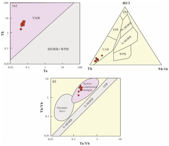 Th vs. Ta diagram (a); Hf/3–Th–Nb/16 diagram (b), modified from Wood [83]; and Th/Yb vs. Nb/Yb diagram (c), modified from [84] for Chahannuo gabbros. Abbreviations: OIB, oceanic island basalts; MORB, mid-ocean-ridge basalts; N-MORB, normal mid-ocean-ridge basalts; E-MORB, enriched mid-ocean-ridge basalts; CAB, island arc calc-alkaline basalt; IAB, island arc tholeiite basalt; WPB, within plate alkali basalt; VAB, volcanic arc basalt.