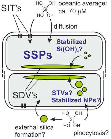 20. Kolbe, F.; Brunner, E. Silicic acid uptake and storage by diatoms. In The Molecular Life of Diatoms, 1st ed.; Falciatore, A., Mock, T., Eds.; Springer: Cham, Switzerland, 2022; p. 349. [Google Scholar] [CrossRef]