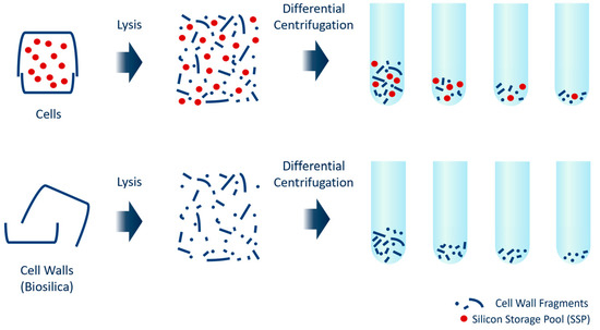 In order to ensure the SSPs are as intact as possible with regard to chemical state, mechanical cell lysis was used instead of the previously established boiling procedure [29]. This was accomplished by using the bead-beating lysis method [21]. Bead beating also circumvents the leaching problem of the established boiling procedure. The lysed material was subsequently fractionated through differential centrifugation. The entire procedure is schematically described in Figure 2 and Figure 3. It was not only applied to freshly harvested cell material, but also to pre-extracted biosilica as reference material (cf. Figure 2) to evaluate the presence and amount of potentially bead-beating-produced cell wall fragments. This biosilica consists of purified cell walls without cytoplasmic material or loosely silica-attached biomolecules [60].