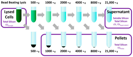 Figure 3. Differential centrifugation procedure. Framed samples were analyzed for tSi with MBA after alkaline treatment. The supernatant remaining after the last centrifugation step at 21,000× g was also analyzed for sSi by MBA without alkaline treatment.