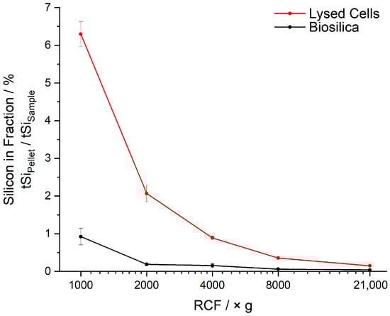 Figure 4. Differential centrifugation of cells lysed by bead beating and pre-extracted biosilica after identical bead-beating treatments. The graph displays the tSiPellet/tSiSample ratio measured in % for the different fractions as a function of RCF in multiples of g. Error bars: Lysis and differential centrifugation was performed twice, so that two samples were obtained for each fraction. All measurements were performed in parallel on these two sample sets. The error bars represent the difference between the two samples A and B (cf. Table 2) obtained for each fraction by standard addition. Plotted data points are the average values.