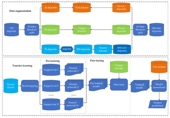 Data augmentation is task-specific and should be conducted to yield data that are well-suited to the subsequent training tasks. In this study, 20% and 15% deposit samples were randomly selected from the original dataset of positive labels. They were combined with an equal number of randomly selected non-deposits to constitute the test and target domain dataset, respectively. SOMTE was then conducted on the remaining 76 deposits and 304 non-deposits to generate a synthetically balanced dataset of the source domain (Figure 3).