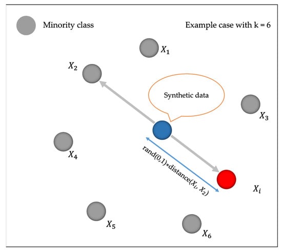 An imbalanced dataset consists of variable classes that are not approximately equally represented [49]. It is widely acknowledged that machine learning algorithms display poor performances in the analysis of highly imbalanced datasets [22]. However, it is a fact that non-deposit sites (negative samples) largely outnumber deposit locations (positive samples) in any case study of MPM, leading to a severe issue of imbalanced datasets. This issue can be addressed by assigning costs to training samples of different classes or by re-sampling the original dataset. The latter solution, which includes over-sampling the minority class and under-sampling the majority class, is commonly used in machine learning-based MPM. SMOTE, proven to be effective in MPM predictions [17,50], was employed in this study to over-sample minor deposits. SMOTE works by generating new synthetic samples from the existing samples of minority class based on their nearest neighbors in the feature space. As depicted in Figure 4, for a given minority-class sample Xi, k (k = 6 in this example) nearest neighboring minority-class samples are chosen. X2 is randomly selected from these four samples, and then a feature vector along the line segment between Xi and X2 is generated. A synthetic sample Xn is created by using Equation (1) [51].