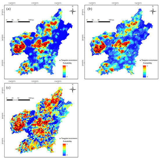 Geologically, the mineral systems approach was employed to translate our understanding of the tungsten mineral system into mappable exploration criteria, resulting in 8 evidential maps that represent the source, transport, physical trap and chemical deposition processes critical to ore formation. The feature weights of evidential layers, measured by information gain, imply that most selected evidence makes major or significant contributions to the final predictions (Figure 13). As a direct indication of targeted mineralization, W anomalies impose the greatest influence on the predictive results. Proximity to Yanshanian intrusions and density of fault intersections, corresponding to spatial proxies of ore-forming parent magmatic rocks and regional structural that have been rightly recognized as ore-controlling factors, exert important influence on the predictions. It is interesting to observe that Mn anomalies make equal contributions to prediction as above-mentioned well-recognized elements, which is consistent with our previous study [9], implying that Mn derived from host rocks may exert a significant control on wolframite precipitation. Magnetic anomalies, fault density and Fe anomalies make secondary contributions to predictions. It is worth noting that gravity anomalies are interpreted as contributing little to predictive results, implying their failure in spatially representing buried intrusions. This raises a limitation problem of this study based on 2D maps, namely, the lack of evidential layers that can effectively portray ore-related processes at depth. Three-dimensional inversions of geophysical anomalies derived from high-resolution gravity, magnetic and resistivity data are excellent solutions to this problem. They are efficient at tracing intrusive rocks, fault network and ore-controlling/-bearing structures at depth [65,67]. Unfortunately, such data are costly and generally available at deposit-scale; thus, they cannot be utilized in a regional-scale MPM at present. Integrating such evidence into future work would improve the effectiveness of predictor maps and boost the performance of predictive models.
