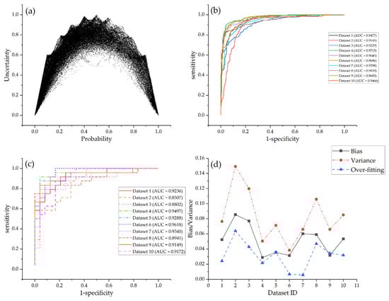 Model performance of few-shot learning models: (a) scatter plot showing probability versus their quantified uncertainty; (b) ROC curves for training datasets; (c) ROC curves for test datasets; (d) measurement of over-fitting on different datasets.