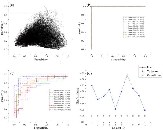 Model performance of random forest models: (a) scatter plot showing probability versus their quantified uncertainty; (b) ROC curves for training datasets; (c) ROC curves for test datasets; (d) measurement of over-fitting on different datasets.