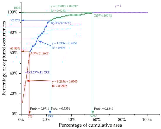 Aiming to generate a robust prospectivity map with lowest uncertainty, the FSL models are chosen as the final predictive models. However, it is still a challenging task to extract the optimal exploration targets from resulting FSL models. Reliance on excessively extensive prospective zones would greatly increase exploration costs, whereas the use of too limited targeting zones would reduce the success rate of prospecting. Therefore, predictive efficiency, considering both success rate and delineated area, is essential for the targeting task. A success rate curve is employed here to measure the predictive efficiency of the proposed models, as shown in Figure 10. Four segments of success rate curves are clearly identified with fitting coefficients greater than 0.92. Given that the slope of the fitting curve indicates the ratio of successfully predicted deposits versus the delimited area, it can be employed as an effective means of quantifying the predictive efficiency. The first segment of success rate curve represents the predictive efficiency of those cells with top probabilities, thus reflecting the most important aspect of a model’s predictive efficiency. The slope of the first segment of success rate curve is 8.293, with high coefficient of determination of 0.9992. The end point of the first segment or the intersection point of the first and the second segments (Point A in Figure 10) corresponds to 7% of the cumulative area on the x axis and 61.86% of included deposits on the y axis, indicating that 61.86% of known mineral deposits are captured within 7% of the study area. This result is superior to the best predictive efficiency of 6.7797 yielded from previous MPM modeling in this region [9]. The slopes of the second and the third segments of the success rate curve dramatically decrease to 1.913 and 0.1901, respectively, depicting rapid decline in predictive efficiency with decreasing probability.