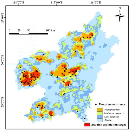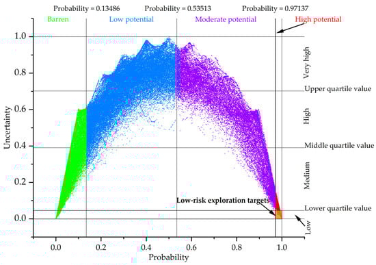 Different slopes of success rate curves suggest different predictive efficiencies. Thus, the intersections of different segments of success rate curves (i.e., Points A, B and C in Figure 10) imply possible threshold values for the classification of different prospectivity levels. In this regard, four levels of mineral prospectivity, namely, high potential, moderate potential, low potential, and barren zones, are identified from Figure 10, based on which a prospectivity map is generated (Figure 11). Uncertainty is employed to further estimate the reliability of predictive results, reducing exploration risk. However, there is no common criteria for selecting threshold value for masking high uncertain cells [4]. In this study, four levels of uncertainty, namely, very high, high, medium and low, are determined based on the threshold values of three quartiles of uncertainty values. Considering both predictive efficiency and exploration risk, the final targets for future exploration fall on the cells with high potential and low uncertainty, as shown with the brownfield zone in Figure 12. This zone represents updated targets from the high-potential regions, which can be projected to Point D in Figure 10, located above the first segment. The final low-risk exploration targets only cover 4.27% of the area but capture 41.53% of known tungsten deposits (Figure 11), achieving the best predictive efficiency of 9.7155.