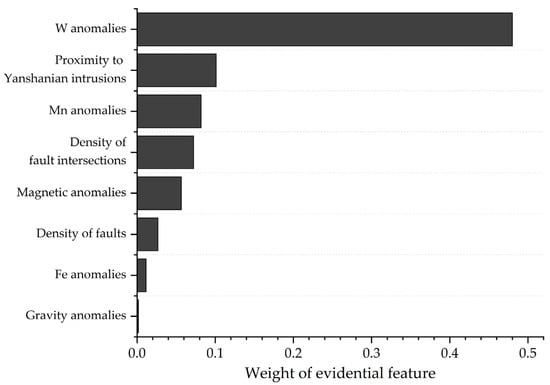 The evidential layers are featured predictive maps representing critical ore-forming processes. They are employed as judging conditions for the prediction of mineral potential. As mentioned above, eight evidential layers were generated on the basis of analyses of the mineral systems approach (Figure 2). The mappable intrusions, faults and geophysical anomalies were derived from the Database of Ganzhou Bureau of Geology and Mineral Resources (DGBGMR) based on field investigations since the 1980s. Geochemical anomalies of W, Mn and Fe were extracted from stream sediment data of Nanling Range, which stem from China’s National Geochemical Mapping Project with sampling density of one sample per km2 [43,44]. The eight predictor maps were generated by rasterizing mappable ore-related features. The rasterizing cell size, i.e., predictive resolution, was 450 m. This was determined based on the resolution of evidential maps and distance between any two nearest deposits [9,45,46]. A total of 195, 174 cells were generated, covering the whole study area.