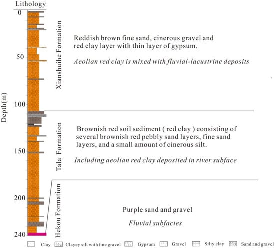 The Hongzhuang section is located near Hongzhuang Village (35°48′40″ N, 102°33′24″ E), approximately 10 km southeast of the main urban area of Xunhua County (Figure 1b). The thickness of the whole section is 240 m, and the stratum is roughly horizontal. The Cenozoic strata are continuous and well-exposed, and are in angular unconformity contact with the underlying Cretaceous Hekou Formation. This section consists of the Cretaceous Hekou Formation, the Paleogene Tala Formation and the Neogene Xianshuihe Formation (Figure 2). According to field observation, Hongzhuang section is mainly composed of red clay, which can be divided into three lithologic subfacies from bottom to top (240–0 m): (1) 240–238 m, which is a purple sandy conglomerate of the early Cretaceous Hekou Formation. (2) 238–106.8 m, which is the alternating deposition of the Oligocene Tala Formation eolian red clay and fluvial sandy conglomerate, including a small amount of gray gravel deposition and gray black mudstone. The conglomerate is well-rounded and mainly composed of fine gravel. The eolian clay debris developed loess columns, vertical joints developed well, and gullies developed along the vertical joints (Figure 1d,e), which is very similar to the sedimentary characteristics of palaeosol on the Chinese Loess Plateau (Figure 1f), and these sedimentary characteristics have been confirmed to be the result of eolian genesis [26]. However, Figure 1f shows a poorly developed paleosol in the Miocene compared to the Quaternary paleosol. (3) 106.8–0 m, it is the alternating deposition of eolian red clay and fluvial–lacustrine facies in the Miocene Xianshuihe Formation. The lower part is mainly eolian deposits, and the grain size of the sediments gradually becomes coarser and coarser upwards, turning into fluvial–lacustrine deposits. At 54 m, a thin layer of gypsum and eolian red clay began to appear (Figure 1g).