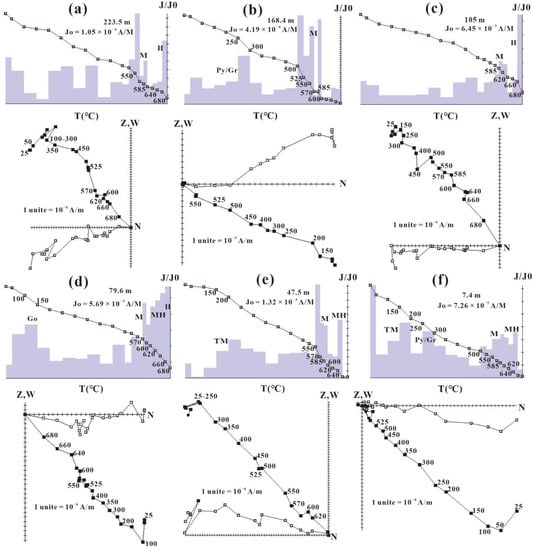 Representative thermal demagnetization diagrams of oriented paleomagnetic samples from Hongzhuang section (directions are the original data in geographical coordinates). (a) Thermal demagnetization curve and orthogonal vector plot (negative polarity) of the sample at 223.5 m. (b) Thermal demagnetization curve and orthogonal vector plot (positive polarity) of the sample at 168.4m. (c) Thermal demagnetization curve and orthogonal vector plot (negative polarity) of the sample at 105 m. (d) Thermal demagnetization curve and orthogonal vector plot (positive polarity) of the sample at 79.6 m. (e) Thermal demagnetization curve and orthogonal vector plot (negative polarity) of the sample at 47.5 m. (f) Thermal demagnetization curve and orthogonal vector plot (positive polarity) of the sample at 7.4m. The temperature steps used are 25 °C, 50 °C, 100 °C, 150 °C, 200 °C, 250 °C, 300 °C, 350 °C, 400 °C, 450 °C, 500 °C, 525 °C, 550 °C, 570 °C, 585 °C, 600 °C, 620 °C, 640 °C, 660 °C, 680 °C. The solid (open) symbol represents the vertical (horizontal) projections, and the intensity unit is mA/m. J0 is the NRM; Py = pyrrhotite, Gr = greigite; Go = goethite; TM = titanomagnetite; MH = maghemite; M = magnetite; H = hematite.