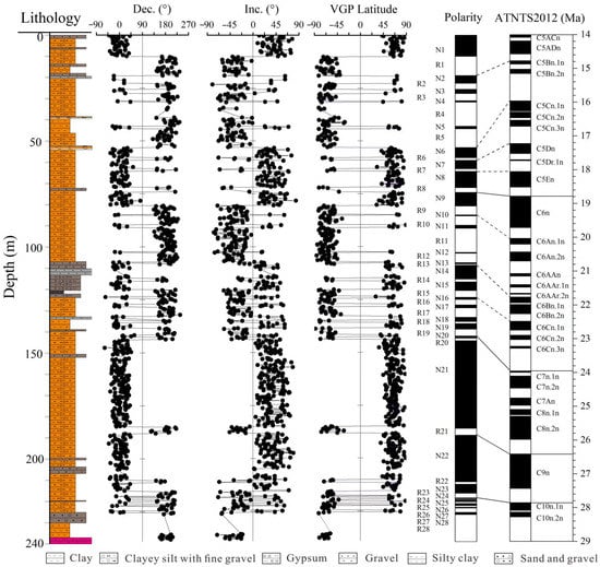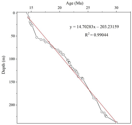 In the process of establishing the magnetic stratigraphic column, at least four consecutive points in the orthogonal diagram are used to ensure that the maximum angular deviation direction (MAD) of the characteristic remanence is less than 15°, so as to calculate the direction of the characteristic remanence. The anomalies and transition points with a VGP absolute value of less than 45° were removed. Among the 983 paleomagnetic samples tested, 863 samples (88%) provided a reliable characteristic remanence direction, and the paleomagnetic polarity was determined by the characteristic remanence direction. The test results show that the profile records the time scale correlation between the established Hongzhuang section magnetic polar column and the standard polar column at 28 positive polarity and 28 negative polarity, and records the continuous magnetic polarity sequence of C5ACn~C10r (Figure 4) [34]. Using the age limit of the magnetic stratigraphic column, the deposition rate of the strata near the polarity reversal is inferred, and the age span of the profile can be calculated to be 30~14.3 Ma. The relationship between stratigraphic age and sedimentary depth is well-fitted, which proves the effectiveness of the magnetic polar column of the Hongzhuang section (Figure 5).